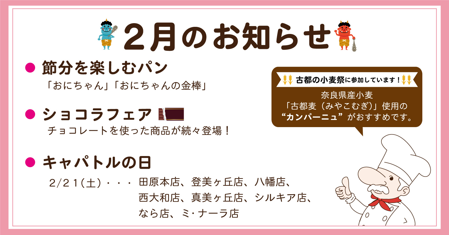【節分を楽しむパン👹】2月3日は節分!「おにちゃん」「おにちゃんの金棒」が登場しております。 【ショコラフェア開催中🍫】チョコレートを使った商品が続々登場!この季… -