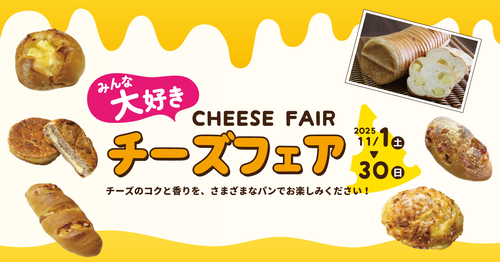 🧀【チーズフェア】🧀開催期間:11月1日(土)~11月30日(日)チーズのコクと香りを存分に楽しんでいただけるパンをご用意しました。定番人気の「丸太チーズ」は、期間中チー… -